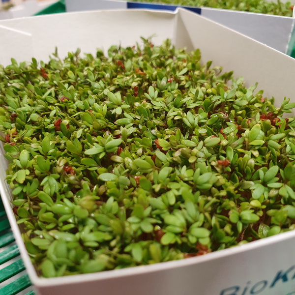 Kresse ist schon nach 7–10 Tagen erntereif. Beim Keimen bleibt von den Samen oft nur die Hülle übrig. Diese kann sich in den zarten Sprösslingen verfangen und mitwachsen. Das sieht zwar nicht so hübsch aus, ist aber völlig normal und essbar. Wer mag, streicht die Hülsen einfach ab.