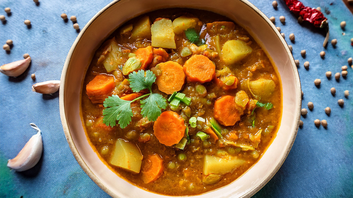 Rapsöl in einem Topf erhitzen. Zuerst Zwiebeln, Kohlrabi und Möhren 5 Minuten anbraten, dann Knoblauch, Süßkartoffeln sowie Linsen zufügen und alles mit Currypulver bestäuben. Kurz weiterbraten und anschließend mit Kokosmilch und Gemüsebrühe ablöschen.