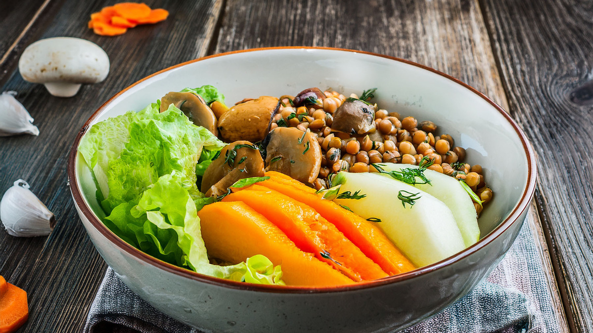 Melonen-Bowl mit Champignons und Linsen