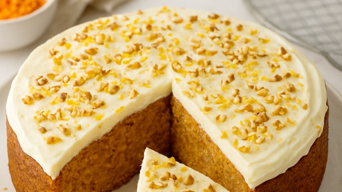 Man kann auch gehackte Haselnüsse, Pistazien oder kleine Marzipan-Möhren auf dem Kuchen verteilen.