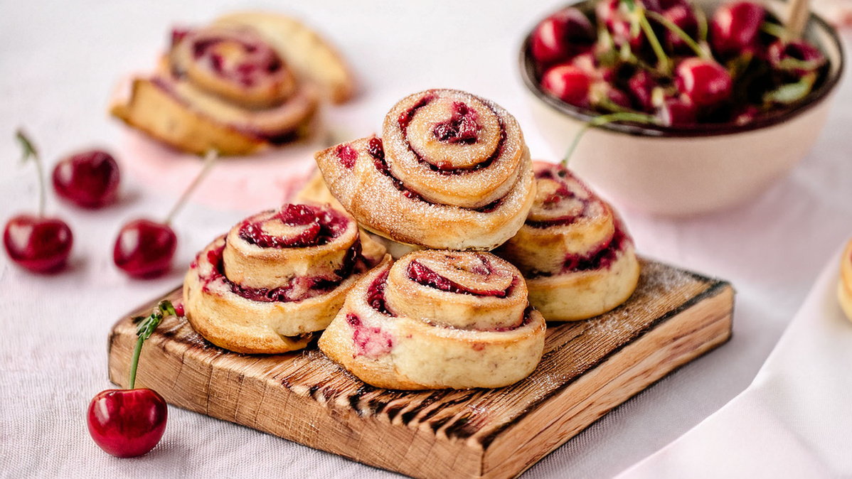 Backofen vorheizen (E-Herd 200°C / Umluft 175°C) Hefeteig auf einer bemehlten Arbeitsfläche nochmals kräftig durchkneten und zu einem Rechteck ausrollen (ca. 24 x 30 cm). Den ausgekühlten Pudding darauf verstreichen, dabei einen 2 cm breiten Rand frei lassen. Nur noch die Kirschen darauf verteilen und von der schmalen Seite her aufrollen. Mit einem scharfen Messer in 12 Scheiben schneiden und auf 2 mit Backpapier ausgelegte Backbleche legen.