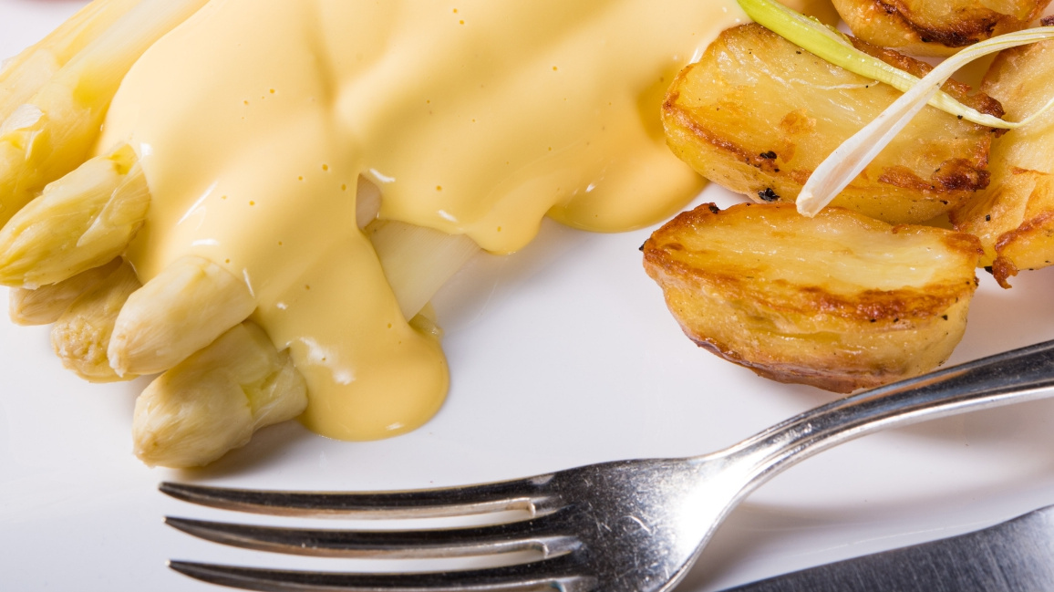 6. Den Spargel aus dem Sud heben, gut abtropfen lassen und auf den Tellern mit den Frühkartoffeln und dem Schinken anrichten. Den Spargel pur mit Butter und Dill oder mit der Sauce Hollandaise genießen.