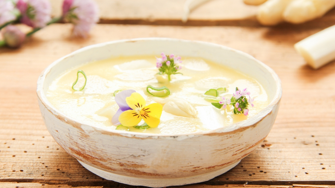 4. Vor dem Servieren Prosecco zufügen und gut umrühren. Mit Spargelspitzen und jungem Mairübchengrün dekorieren.