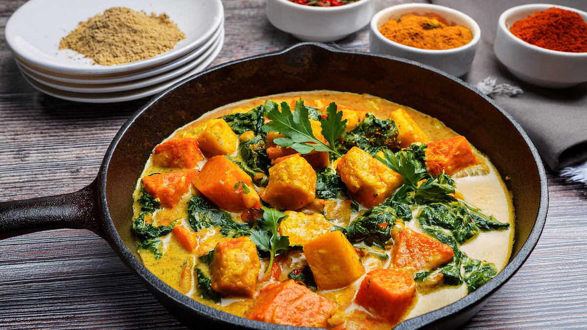 Den Ingwer schälen und fein würfeln, mit den halbgegarten Kartoffeln zu den Süßkartoffeln geben. Die Kokosmilch und den Spinat zufügen und ca. 15 Minuten unter Zugabe von wenig Wasser köcheln lassen. Die Süßkartoffeln sollen nicht zu sehr verkochen.