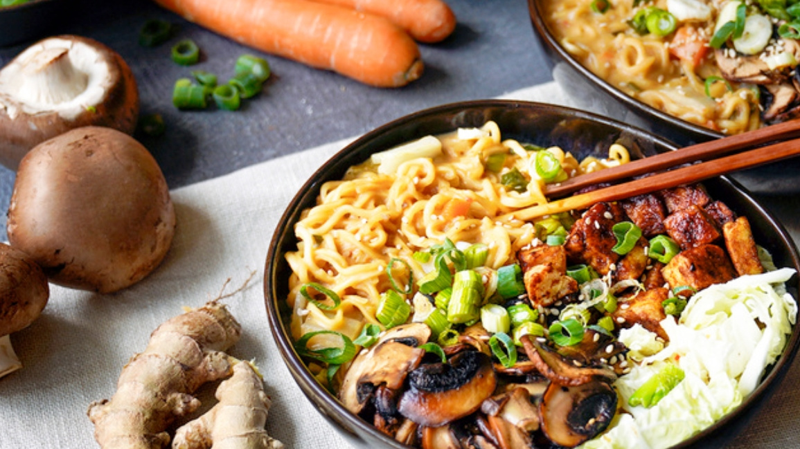 Die fertige Nudelsuppe in Schalen füllen und mit dem knusprig gebratenen Tofu, den Pilzen und dem restlichen in Streifen geschnittenen Chinakohl anrichten, gebratene Lauchzwiebeln darüber geben. Nach Belieben mit Erdnüssen oder Sesam bestreuen und servieren.